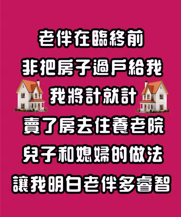 老伴臨終前非要把房子過戶給我,我並不明白他的用意,但是還是聽他的話,和她一起去辦理了過戶。