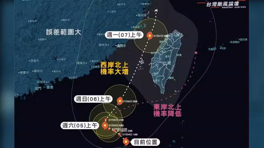 台灣颱風論壇指出,周日(6日)下半天至下周一(7日)白天期間,准丹娜絲颱風將通過台灣海峽或穿越西部陸地北上,這條路徑目前機率較大;另一種可能路徑則是穿越台灣南端,沿著東部近海北上,但機率較低;就目前資料而言,由於路徑變數仍大,相關數據仍在持續調整,預計要等到周六下半天后,颱風的真正路徑才會較為明朗。