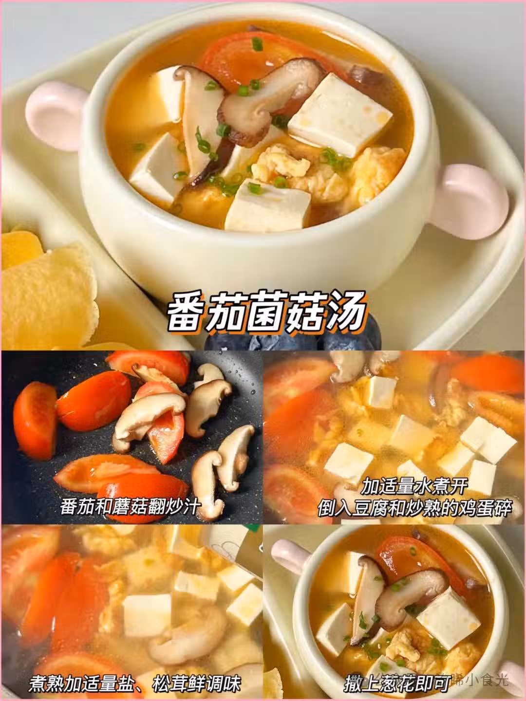 食材:番茄、蘑菇、豆腐、雞蛋、清水、蔥花