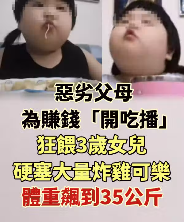 惡劣父母為賺錢「開吃播」狂餵3歲女兒 硬塞大量炸雞、可樂:體重飆到35公斤