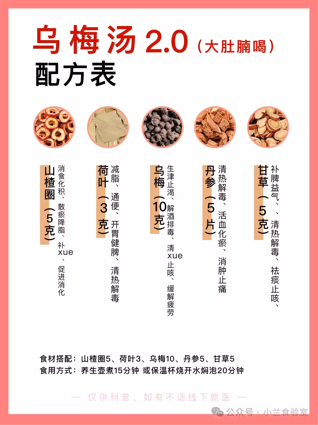 山楂圈5g、荷葉3g、烏梅10g、丹參5片、甘草5g