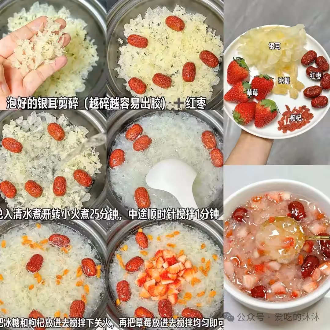 銀耳泡好後剪碎(更容易出膠),和紅棗一起煮30分鐘,出鍋前加入枸杞、冰糖、草莓再燜2分鐘,溫熱喝。
