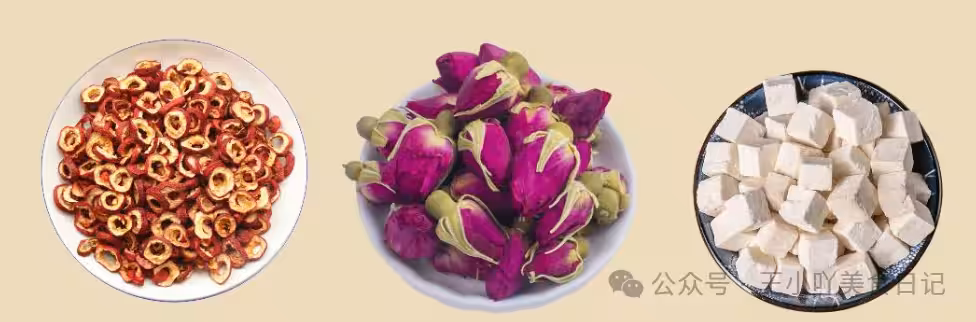 🔸食材:山楂10g + 玫瑰花5朵 + 茯苓10g