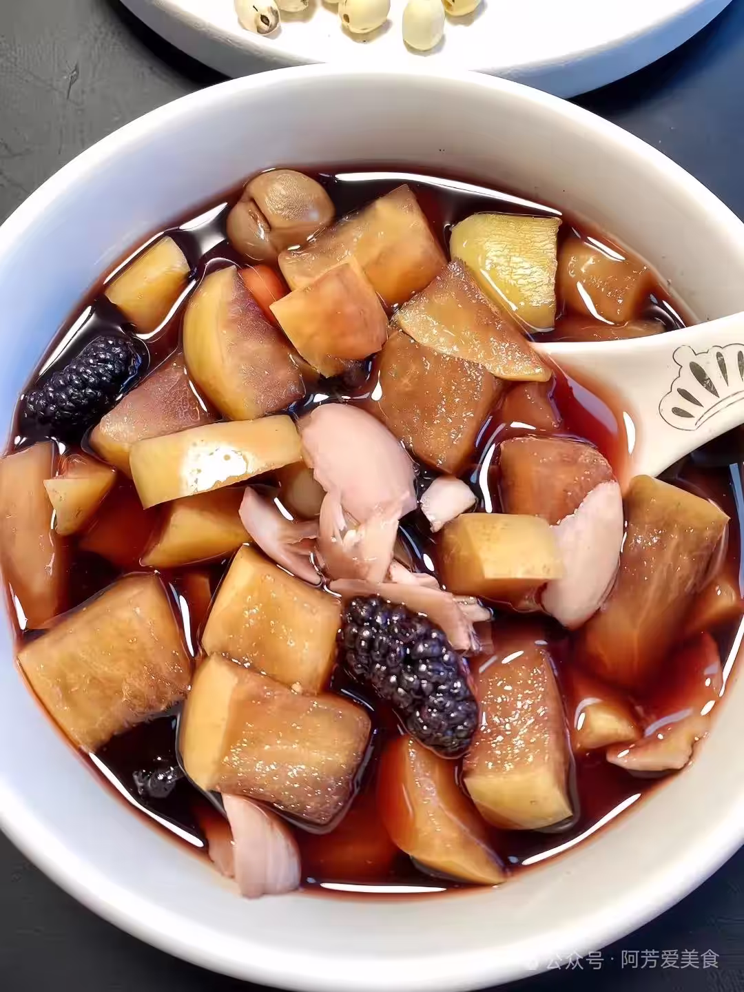 桂圓6顆剝肉,蓮子15克,干百合10克,干桑葚15克沖洗一下。半個蘋果洗凈,不用去皮,直接切小塊。所有材料入鍋,加足量清水,大火燒開後轉小火煮20分鐘即可。