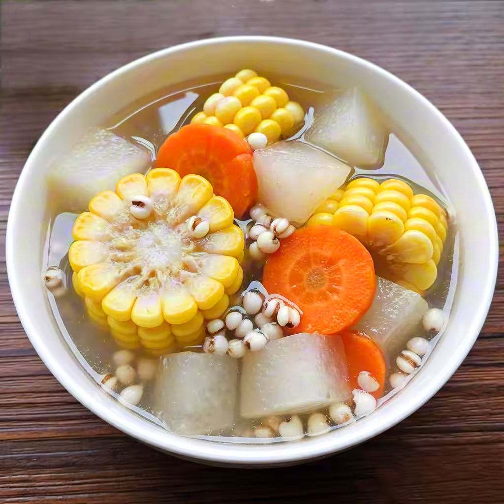 冬瓜500克、玉米1根、薏米30克、胡蘿蔔半根、薑片2片、鹽適量。