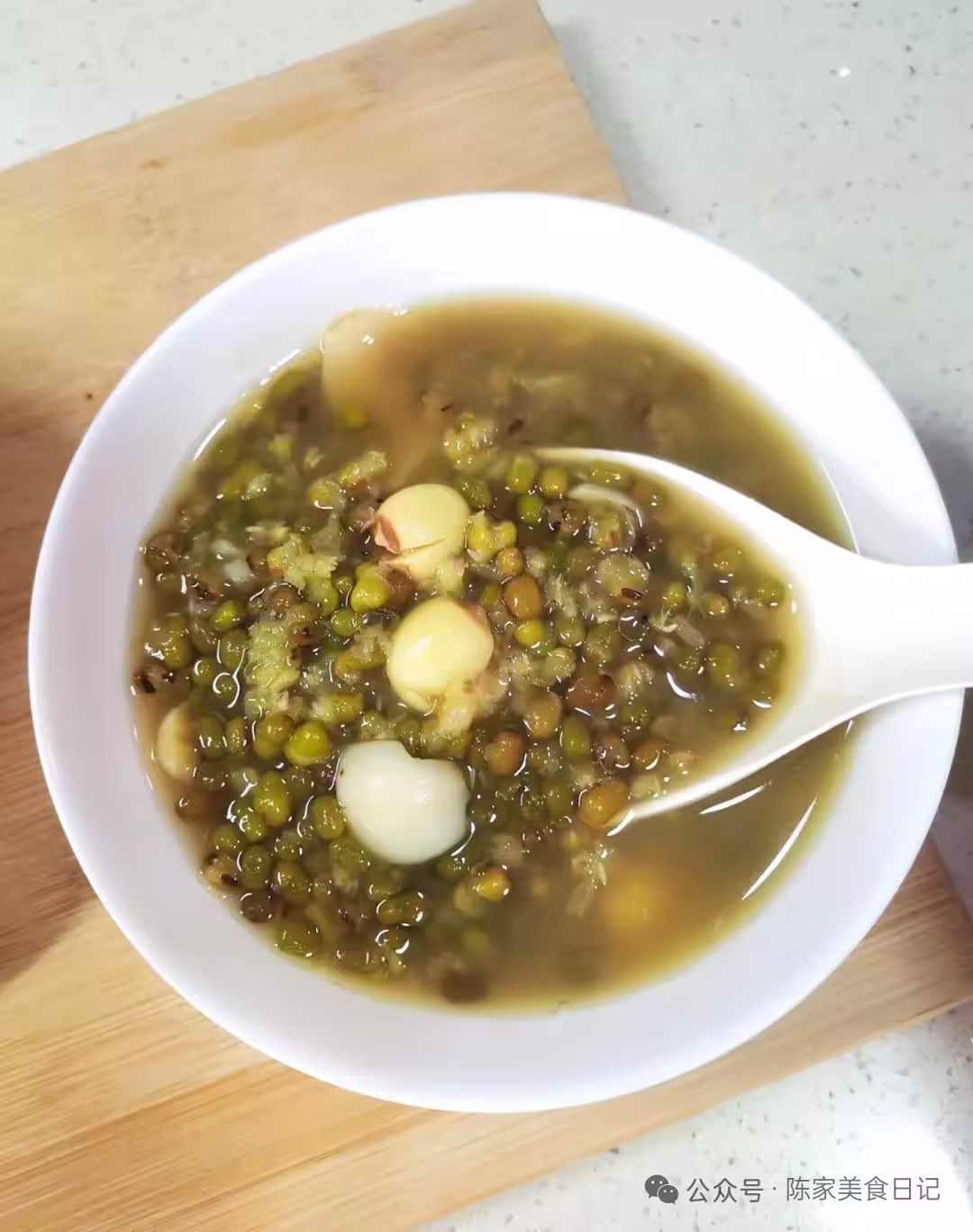 這碗湯是「濕熱天的滅火器」:綠豆專清暑熱,蓮子能把身體里黏糊糊的濕氣「拽」出去,麥冬的潤能防綠豆太涼傷脾胃。喝起來帶著綠豆的清香,冰鎮後像喝甜湯,吃完火鍋、燒烤來一碗,第二天舌苔沒那麼厚,小便也變順暢了。