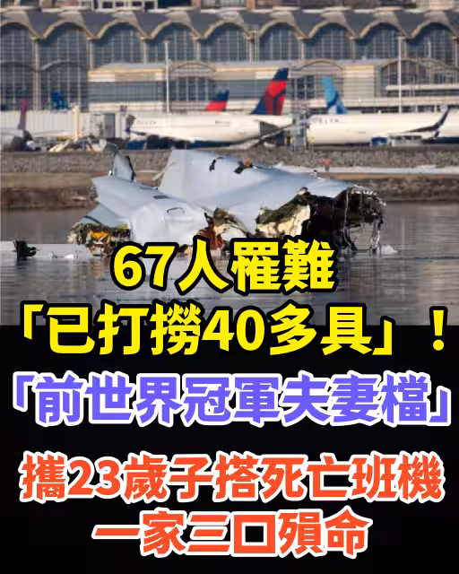 日前才剛發生濟州空難令人心痛,不料不料29日晚間又發生一起震驚美國的重大空難意外,一架載有64人的美國航空客機,與載有3人的軍方黑鷹直升機相撞,兩架飛機雙雙墜入波多馬克河(Potomac River),美國總統川普於30日證實這起空難無人生還,67人全數罹難,知情人悲曝:「世界冠軍夫妻檔也在這次墜機事故中罹難!」