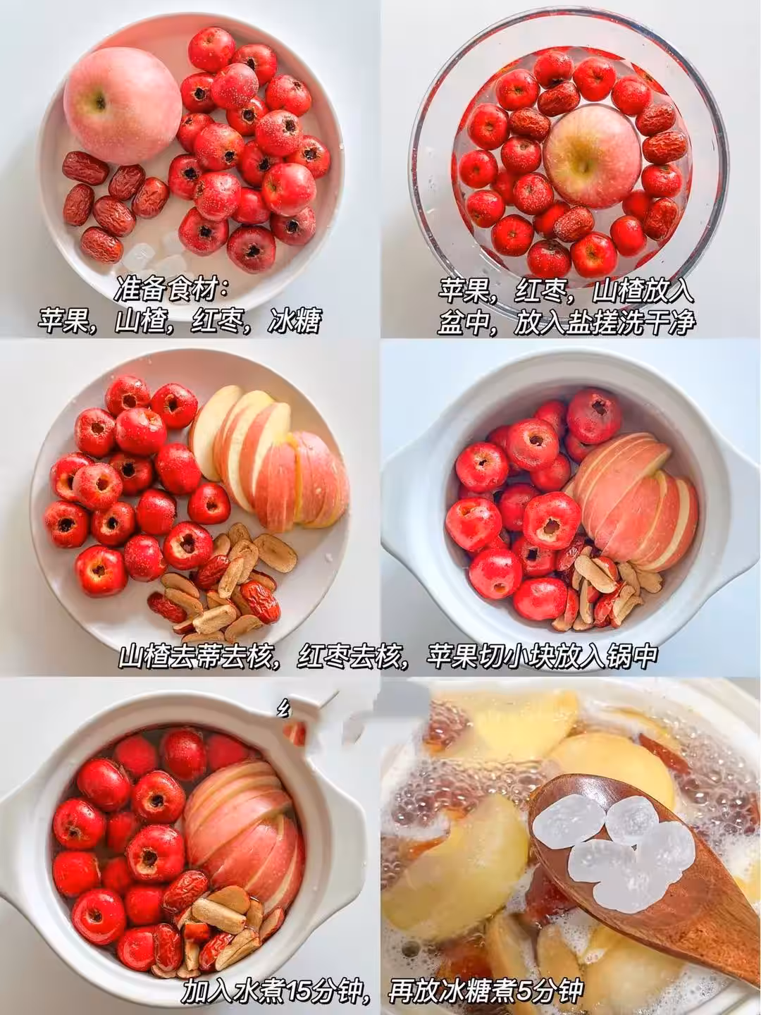 1. 蘋果🍎、紅棗、山楂放入盆中,加入少量鹽和清水,搓洗乾淨,山楂去蒂去核,紅棗去核,蘋果去核後切小塊。