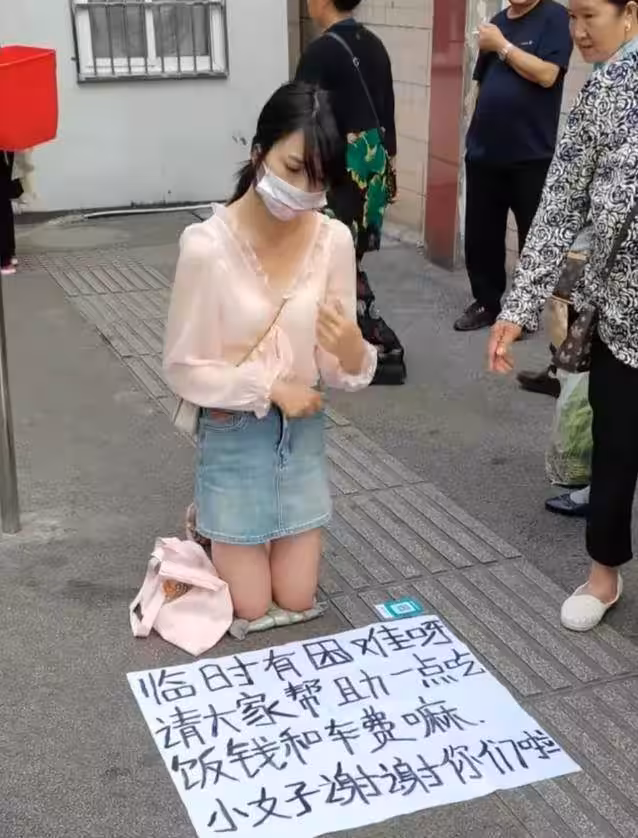 只見這位乞討的女子穿著粉色上衣以及牛仔裙,雖然臉上戴著口罩,但依舊能看出她長得十分清秀,年紀輕輕的她並沒有像其他街頭藝人靠著才藝來引起注意賺錢,反而是直接跪在地上請求大家幫忙。