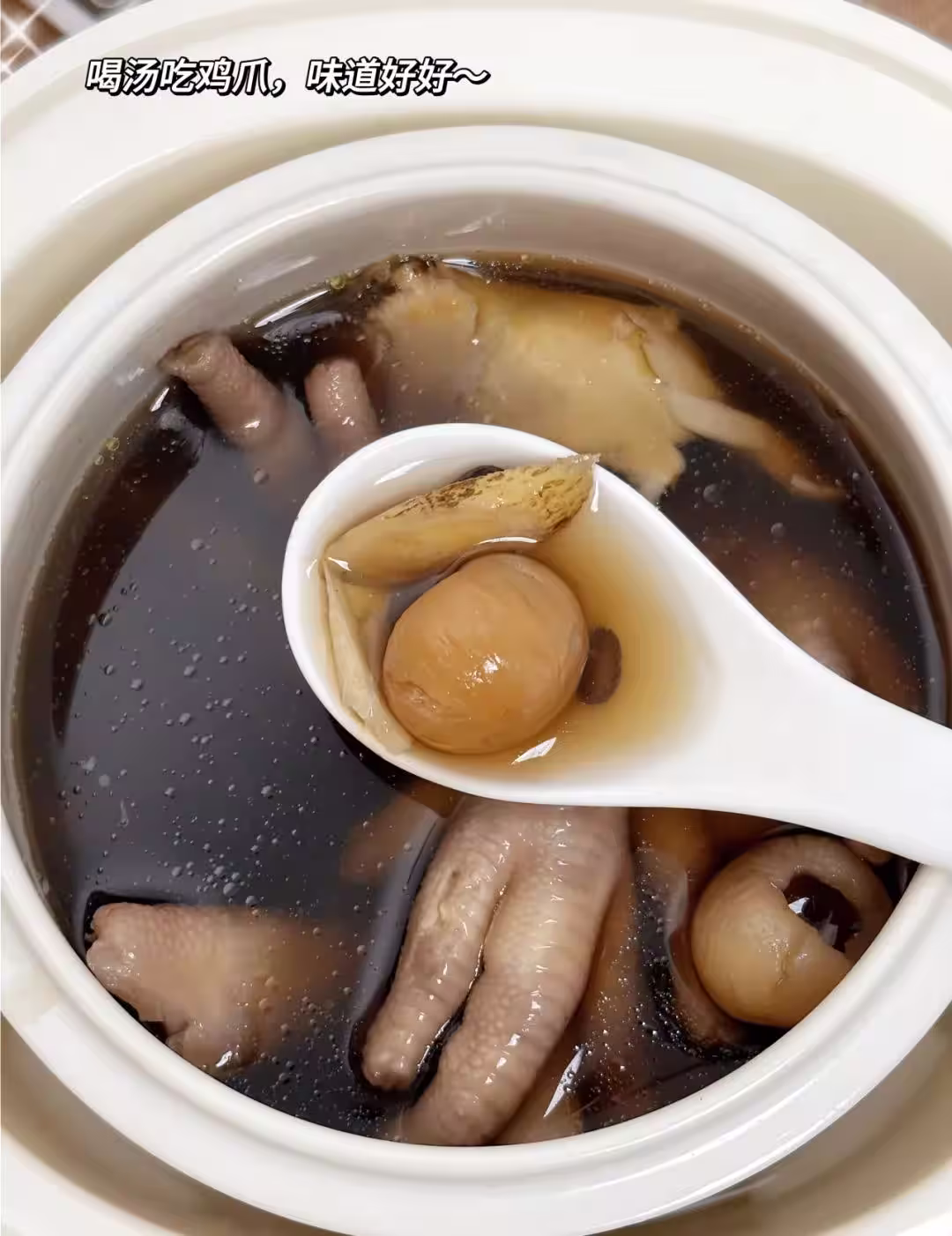 雞爪和黑豆燉出來的湯,黏糊糊的,全是膠原蛋白,對皮膚特別好。當歸活血,桂圓紅棗補血,喝一段時間,連指甲都能變得有光澤。