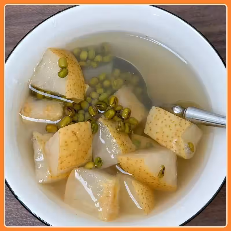 綠豆性涼,雪梨甘潤,共煮成湯,清甜沁人。湯色碧玉般清透,綠豆沙糯綿軟,雪梨塊晶瑩剔透,入口即化。一碗溫涼飲下,清潤燥氣,安撫身心,暑熱頓消,只留滿口生津的舒爽。