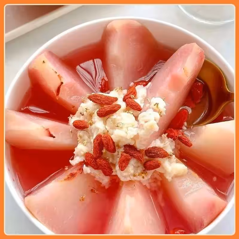 蜜黃色的湯水裡,臥著那被蒸得軟綿綿的桃瓣,已然被剖成成半,透亮的果肉還有點兒嚼勁,滿滿的吸足了酒釀的醇香味兒,清甜又帶點小醉意的液體裹著黏糊糊的米粒,呲溜一聲滑進嘴中,溫溫婉婉又細細綿綿,桃子的色澤跟酒香氣交融一塊兒,甜滋滋的可不膩人,順順噹噹溜進喉嚨,好似夏日裡悠悠飄過的一抹餘韻。