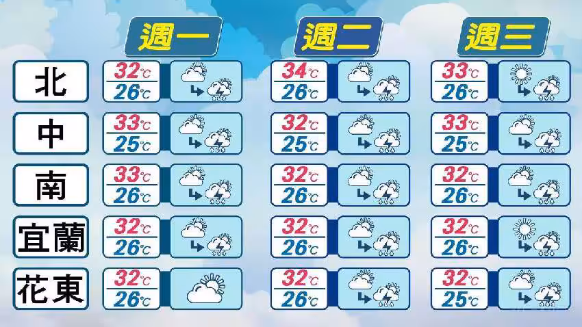整周天氣不穩,午後易有雷陣雨。 至於颱風動態,天氣風險公司資深顧問吳聖宇在臉書發文指出,目前海面上有2個熱帶系統,第5號颱風百合及熱低壓07W都對台灣沒有影響,周四 (17日)之後皆已經北上,太平洋高壓將有機會重新回到日本南方海面到琉球一帶海域, 接著高壓外圍的偏東到東南風就可能跟西南季風配合,在南海到菲律賓以東海域重建新一輪的西南季風槽,當中應該會有新的熱帶擾動發展,周末期間(19、20日)的天氣好壞就跟這個預報中的新熱帶擾動有關。