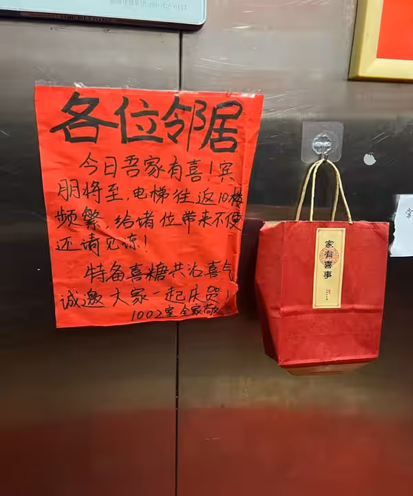 俗話說「千金買房,萬金買鄰」好鄰居的重要性不用多說,即便房子多麼寬敞舒適,要是遇到惡鄰居的話,居住品質絕對會大大下降!而日前就有一位網友分享了一件有關鄰居的趣事,原來他所住的大樓有位住戶家有喜事,因此對方特地在電梯里發喜糖向大家分享喜悅,沒想到不久後電梯居然因此出現了可愛小驚喜...