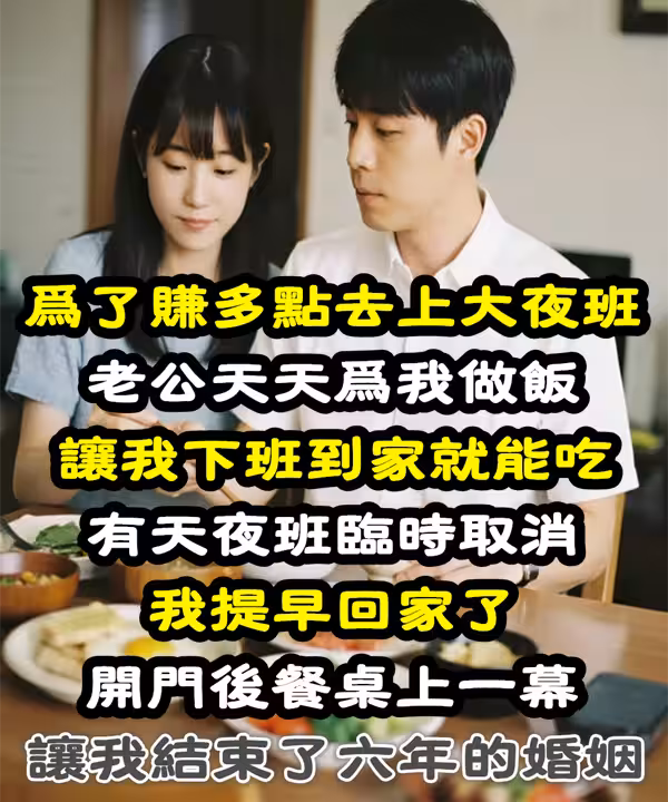 為了賺多點上大夜班「老公天天為我做飯」讓我下班到家就能吃 有天夜班臨時取消...我提早回家「開門後餐桌上一幕..」讓我結束了六年婚姻