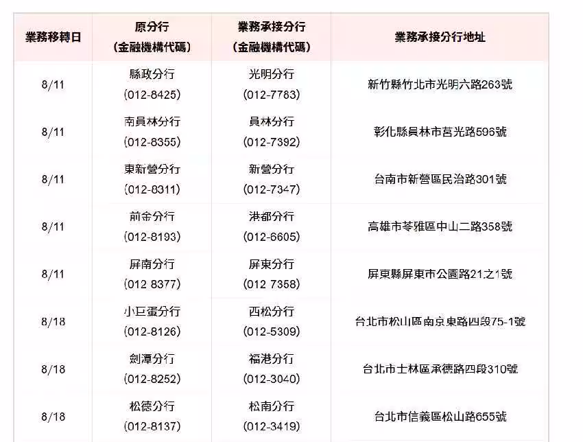 北富銀也宣告,10間分行暫停營業,縣政分行、南員林分行、東新營分行、前金分行、屏南分行,自8月11日起移轉鄰近分行服務;小巨蛋分行、劍潭分行、松德分行、金城分行、光復分行,自8月18日起,移轉由鄰近分行提供服務。