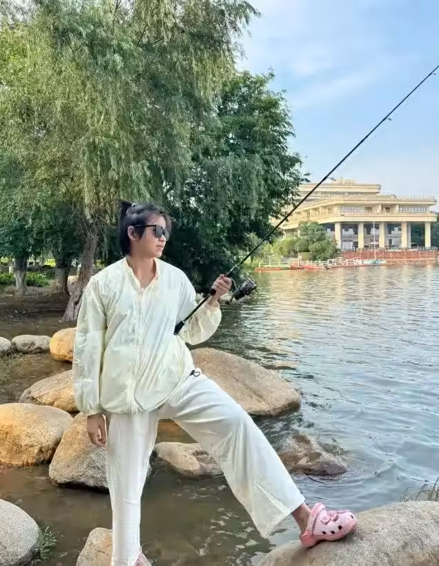 在釣魚的過程中,她眼神專注,盯著水面,等待魚兒上鉤,那種全身心投入的狀態,讓人看到了她在跳水之外的另一面。