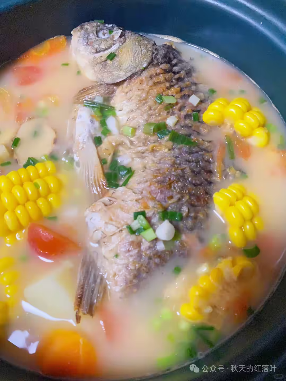 鯽魚湯不僅蛋白質豐富,還特別鮮美,夏天用玉米和胡蘿蔔一起燉,湯色奶白,味道清甜,既能補充營養,又能祛濕健脾。