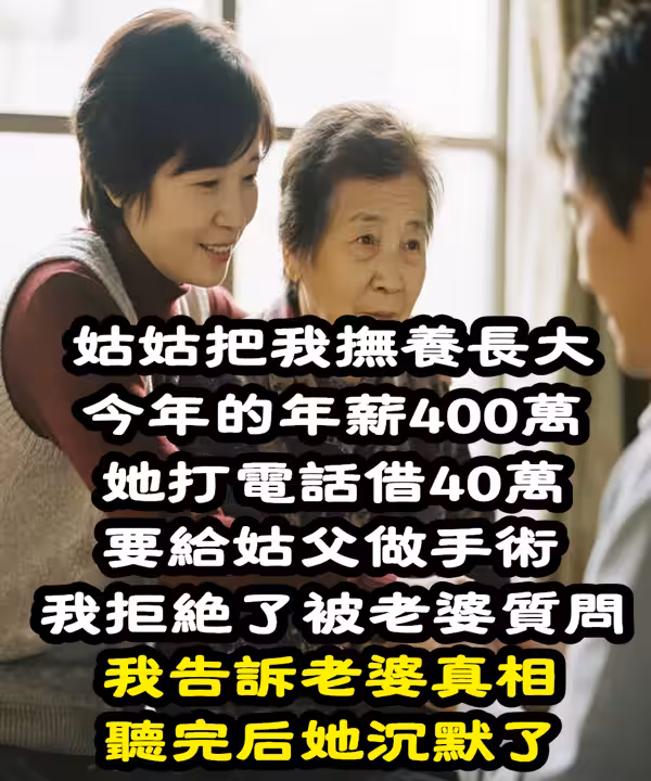 姑姑把我撫養長大!今年薪400萬「她打電話借40萬」給姑父做手術 我拒絕了被老婆質問「我告訴老婆真相」聽完後她沉默了...