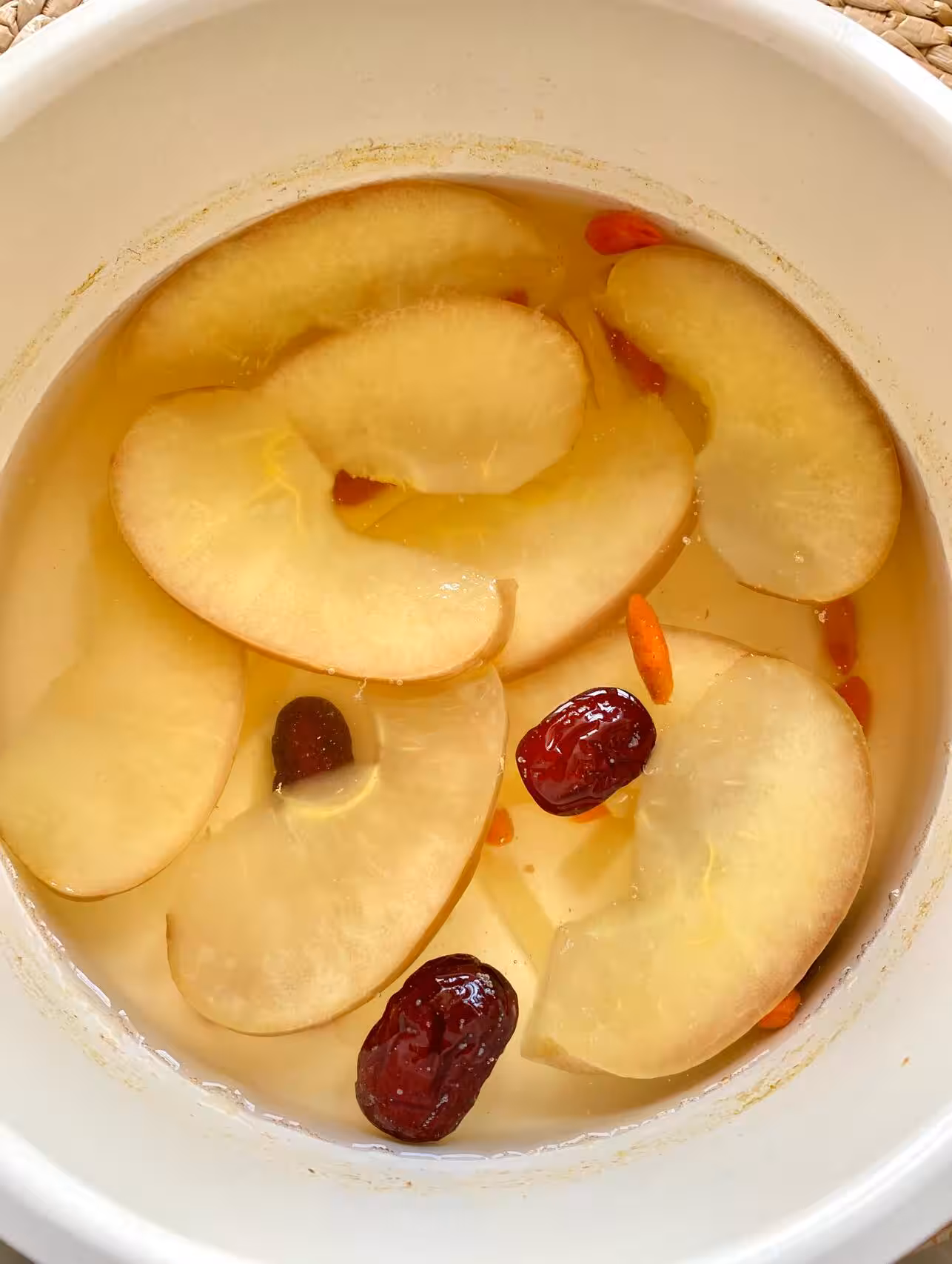 ✔️做法: 蘋果切片,姜切絲,所有材料放入鍋中,加入適量水,中火煮15分鐘左右,煮出湯色。
