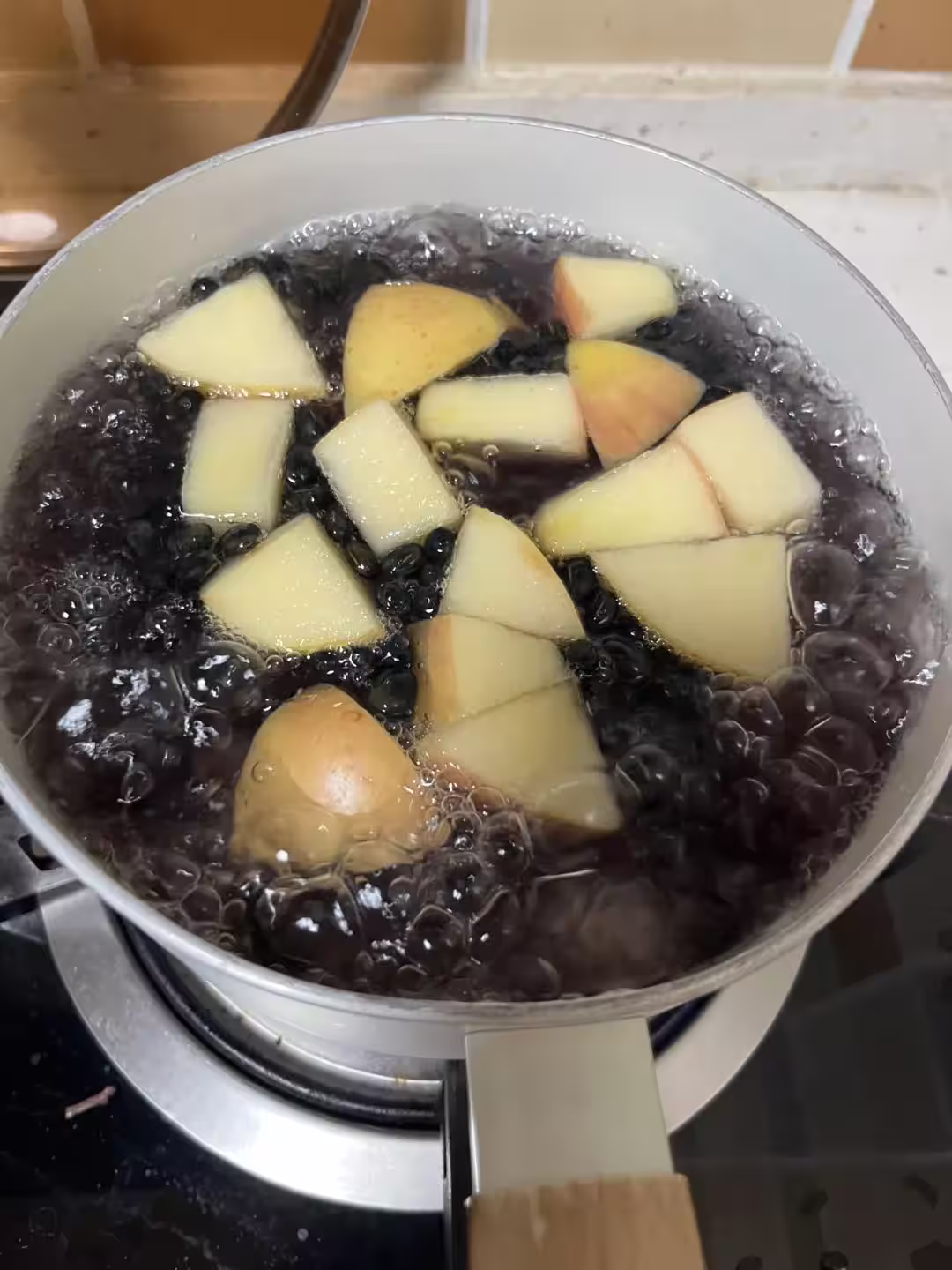 山藥片8-10片,蘋果半個,黑豆20克,加水1000ml煮25分鐘!