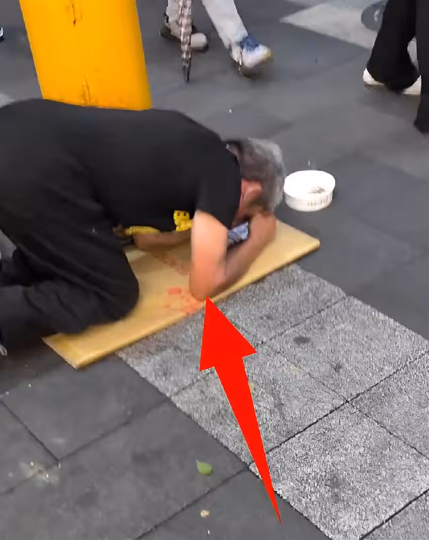 鏡頭前的男人跪在地板磚上,一動也不動,動作就像在膜拜,身邊放著個碗,裡面有零錢,造型行乞,但下一秒卻讓人哭笑不得。