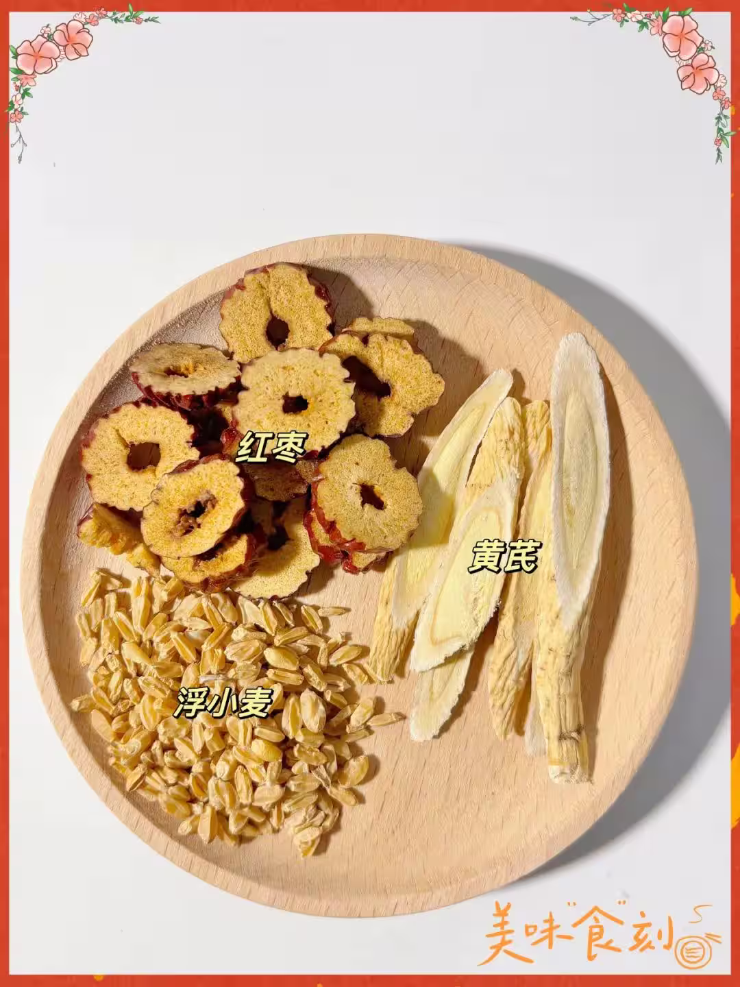 1. 把浮小麥、黃芪、去核的紅棗一起放進鍋里,加清水沖一下