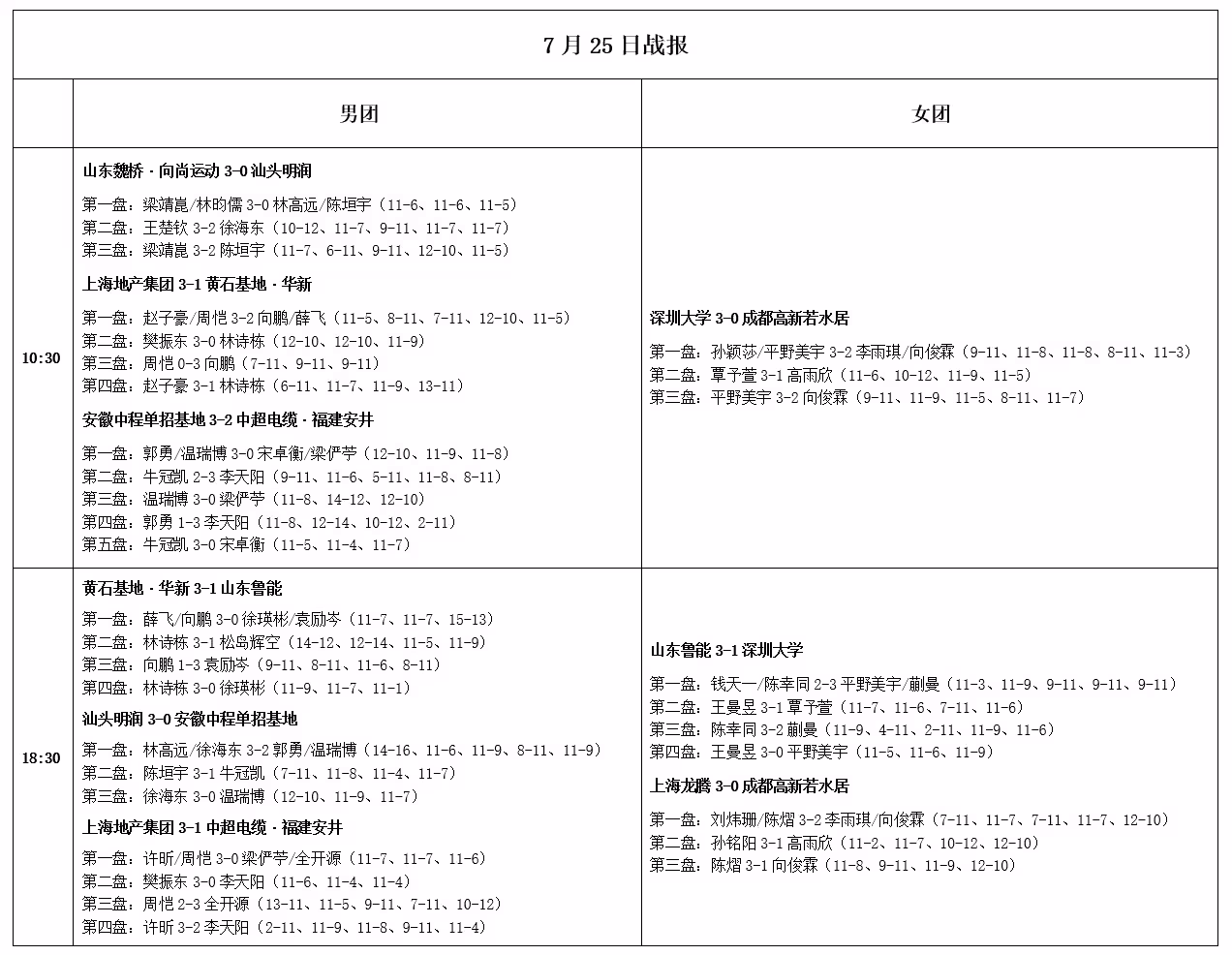 乒超聯賽:7月25日戰果出爐!樊振東王曼昱表現佳,26日賽程公布