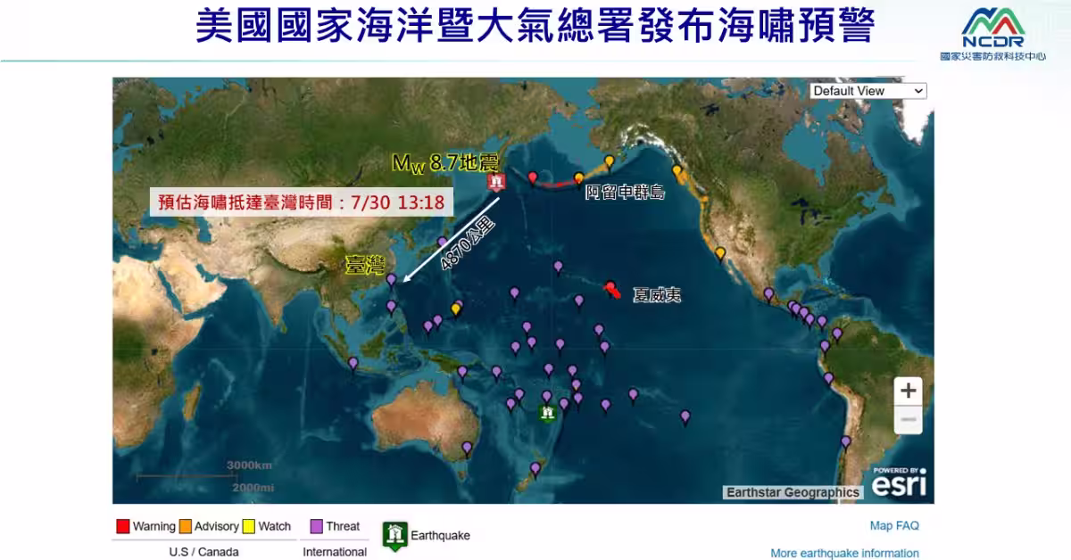 俄羅斯堪察加半島東部外海30日發生規模8.7地震引發海嘯,氣象署預估下午1時18分影響台灣。(圖/國家災害防救科技中心LINE帳號)