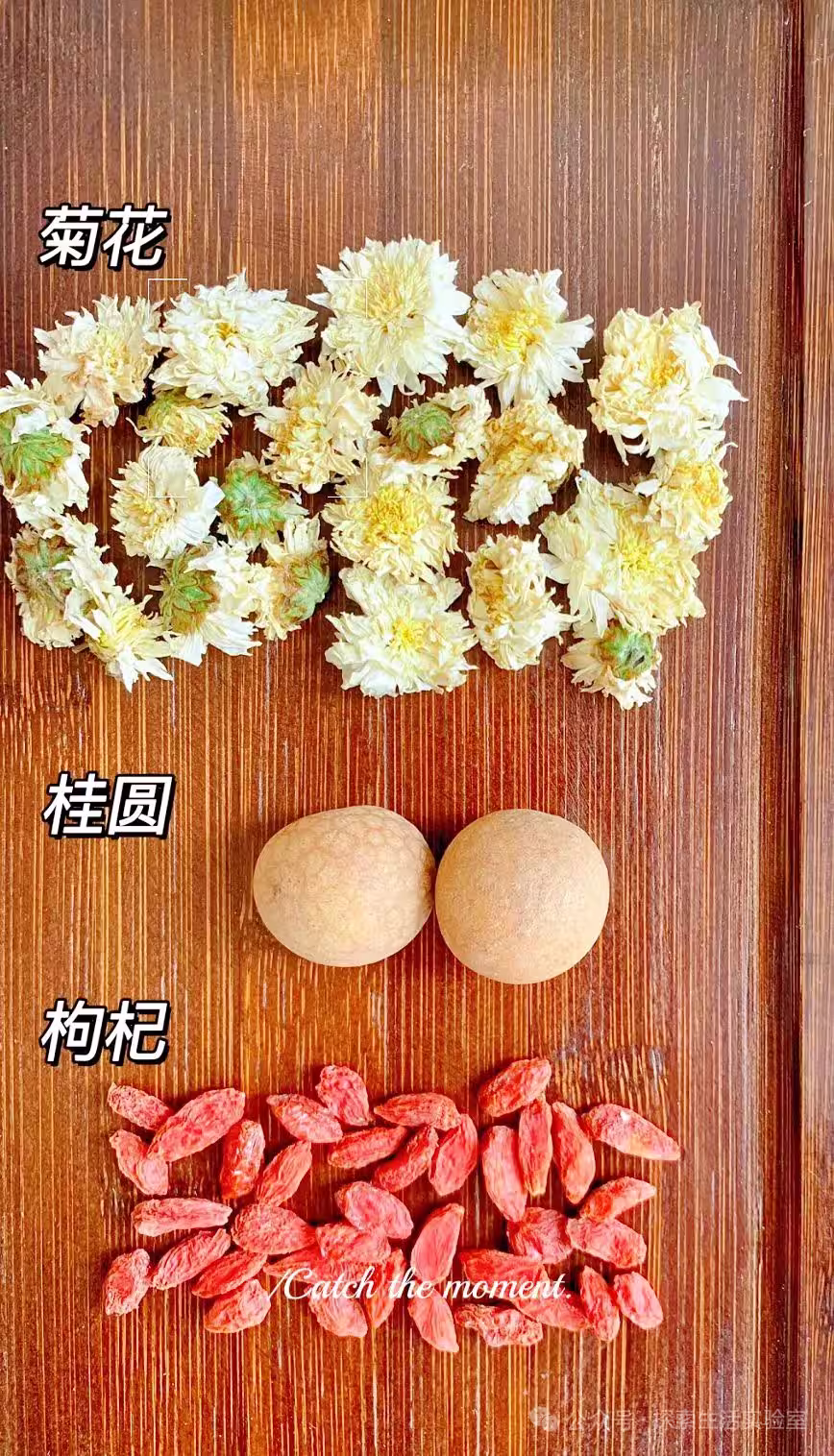 1️⃣桂圓去殼,枸杞沖一下,菊花用清水洗去雜質