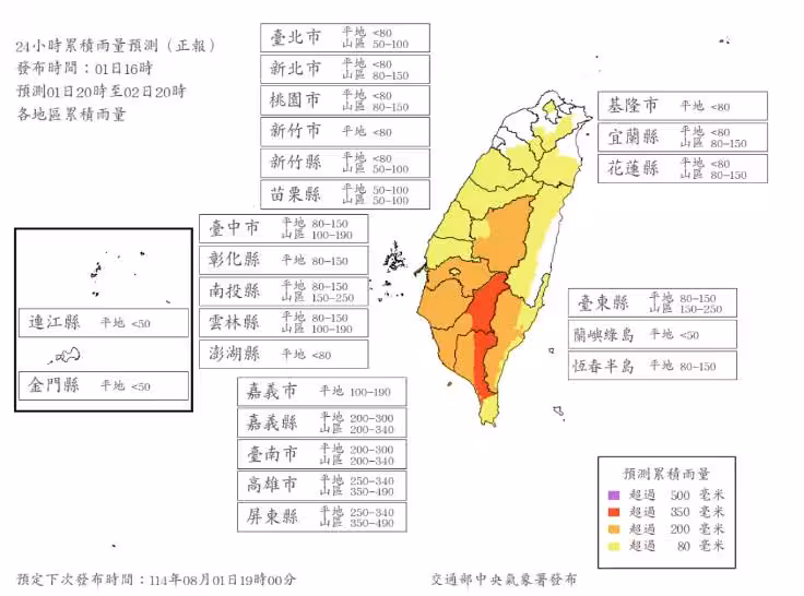 根據氣象署的24小時累積雨量預測,南投縣山區150至250毫米、嘉義縣山區200至340毫米、高雄市山區350至490毫米、屏東縣山區350至490毫米、台東縣山區150至250毫米,達停止上班上課標準。