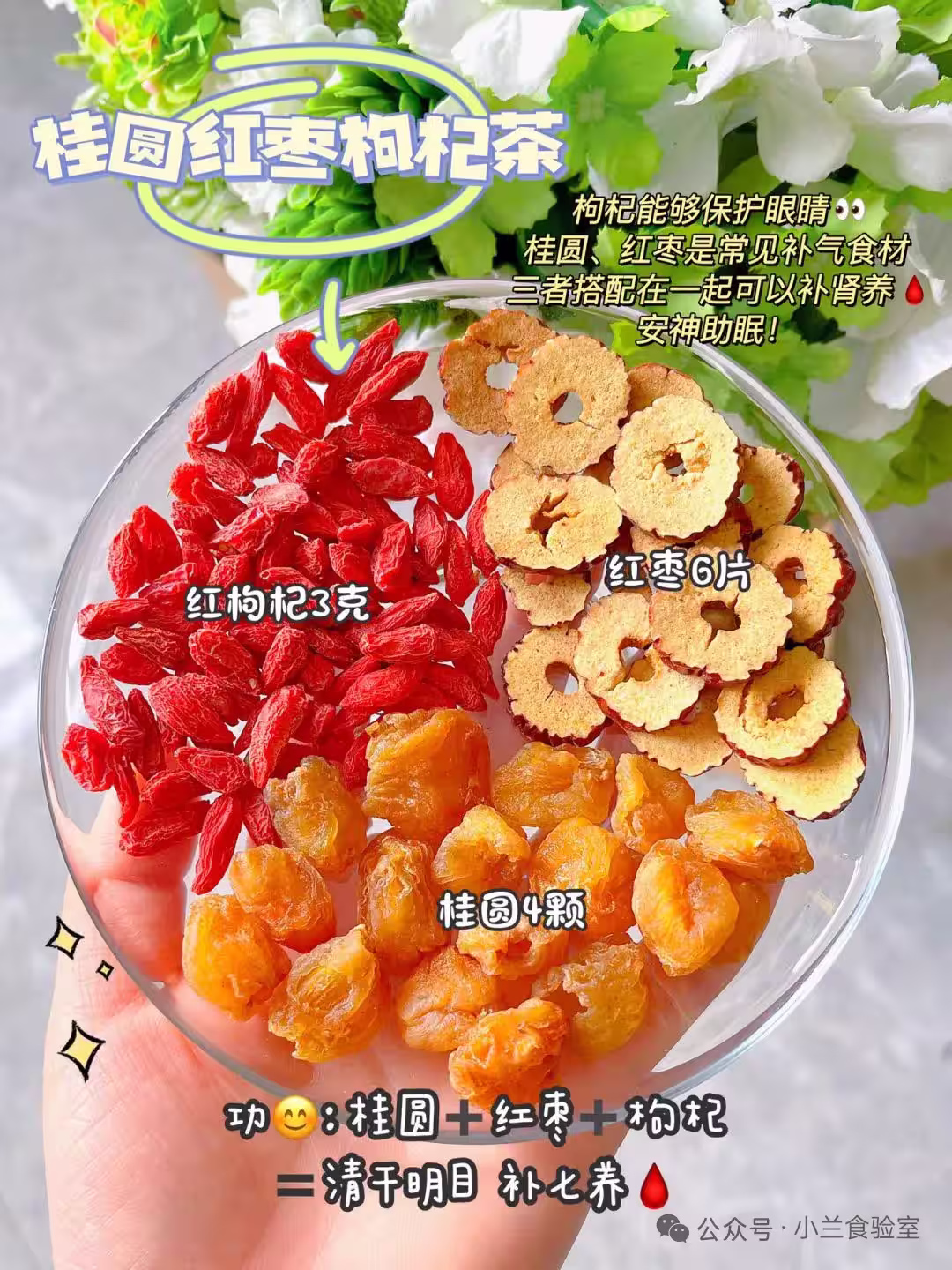 - 清肝明目、補氣養腎、安神助眠。枸杞保護眼睛,桂圓和紅棗補氣,三者搭配能調和身體機能,提升睡眠質量。
