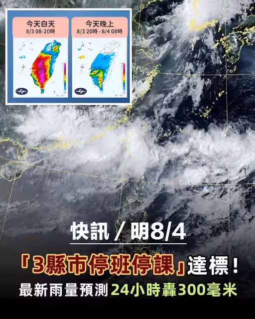 快訊/明8/4「3縣市停班停課」達標!最新雨量預測,24小時轟300毫米