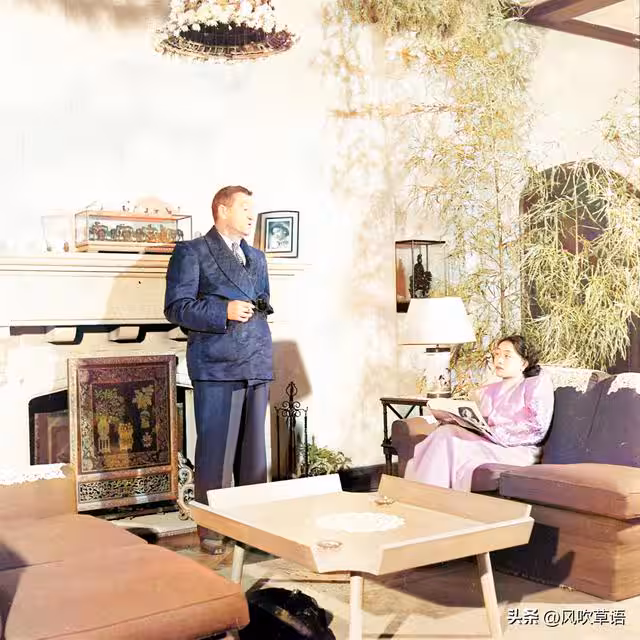 陳納德手裡夾著香煙,靠在壁爐旁。壁爐上放著帶玻璃罩的擺件,牆上掛著陳香梅的肖像照。他們面前的一個茶几造型非常奇特。