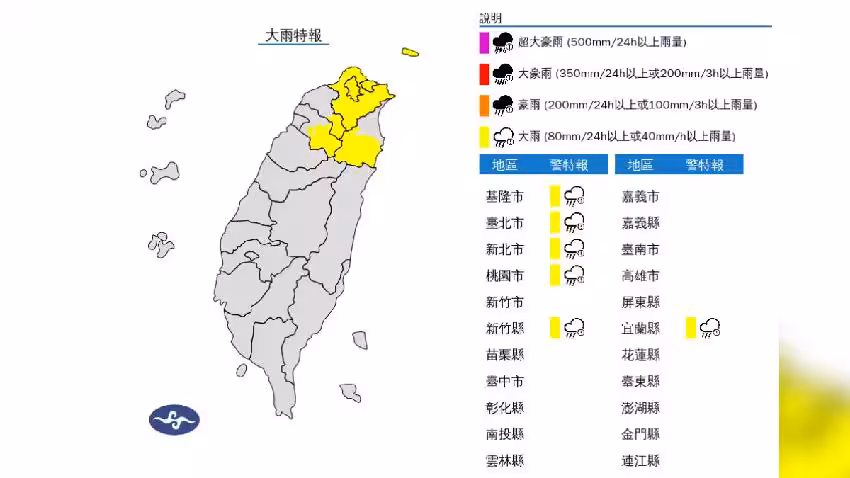 再來,中央氣象署更發布山區暴雨災防告警訊息,警戒區域為新北市烏來區、石碇區、三峽區、新店區,以及桃園市復興區,並針對新北市南勢溪 (紅河谷至龜岩寶島區) 、大豹溪、永定溪 (石碇蚯蚓坑) 、石碇溪 (石碇淡蘭吊橋) ,以及桃園市霞雲溪 (優霞雲瀑布區) 發布災防告警,持續時間至下午2點22分。
