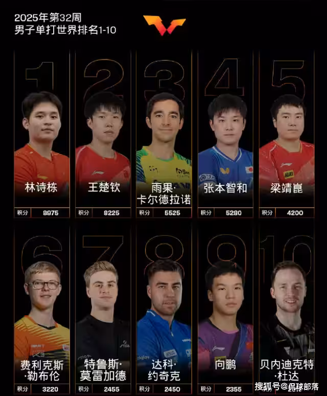 這是國際乒聯8月3日公布的最新一期世界排名,也就是橫濱冠軍賽開打之前的前十排名情況,可以看到王楚欽距離林詩棟只差750分。