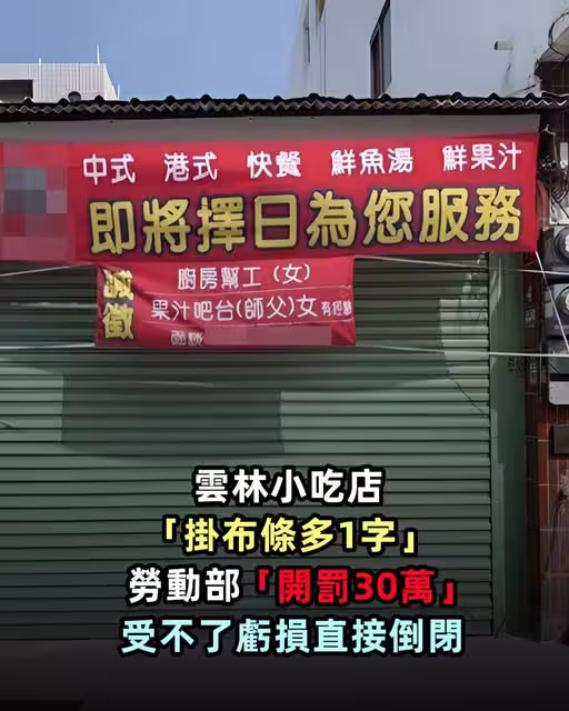 雲林小吃店還沒開業「掛布條徵人多1字」!勞動部「開罰30萬」受不了虧損直接倒閉