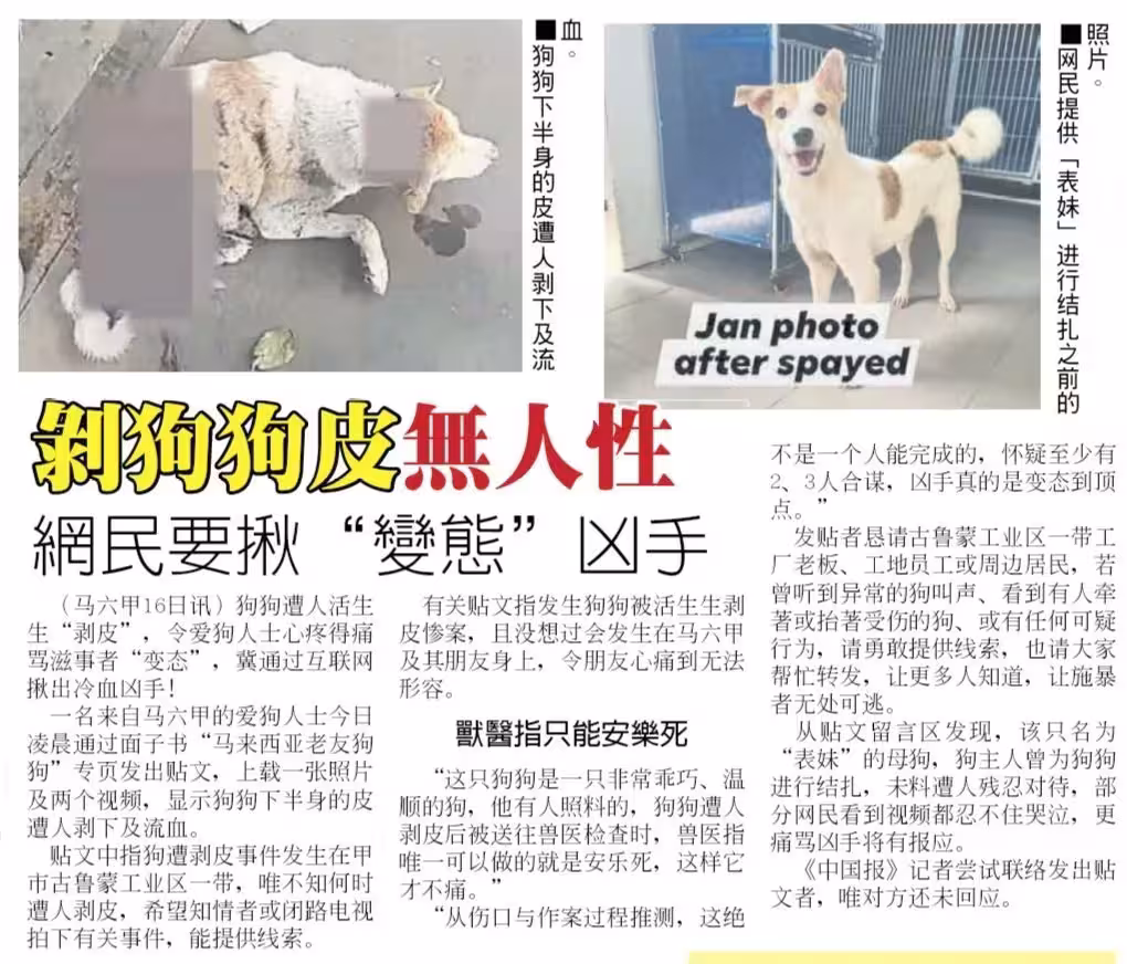 葉春來說,古魯蒙區約兩周前也曾發生毒狗案,不排除有討厭動物的極端人士或外勞所為,尤其該只慘遭剝皮的雌狗,較後送到獸醫治療時,獸醫指此行為是需兩人才有能力動手剝狗皮,所以外勞的嫌疑最大。