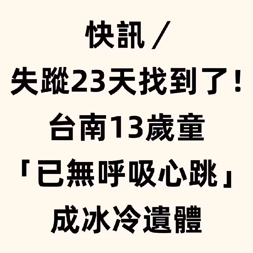 快訊/失蹤23天找到了!台南13歲童「已無呼吸心跳」成冰冷遺體
