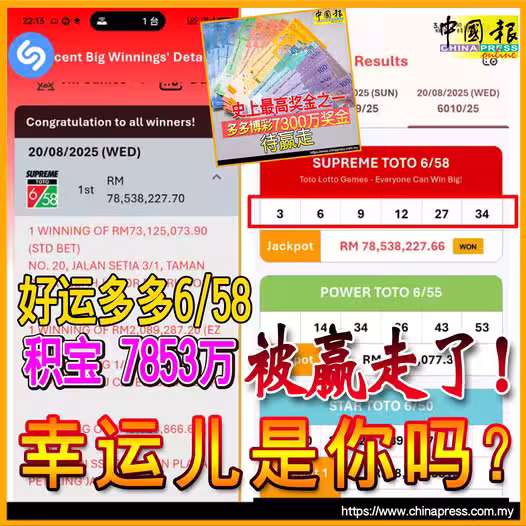 (吉隆坡20日訊)好運多多六合彩(6/58)為數逾7800萬令吉的獎金,今晚被3名幸運兒贏走,其中來自柔佛的幸運兒獨得7300萬令吉!