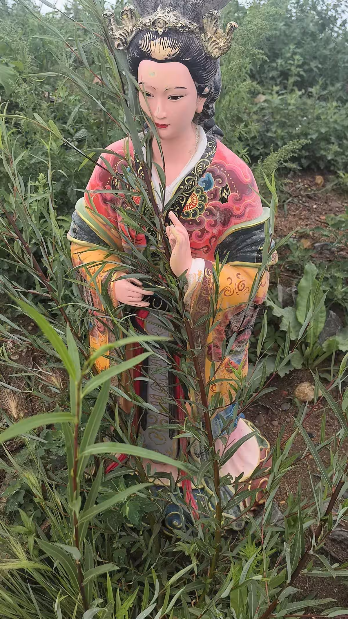 出於好奇和敬畏,我輕輕地走近聖像,並試圖清理它周圍的雜草。在這個過程中,我發現聖像的手印並不像常見的佛教手印,於是便拍照發給了師父。師父告訴我,這是一尊碧霞元君的聖像,碧霞元君又被稱為泰山老奶奶,是地區的保護神。