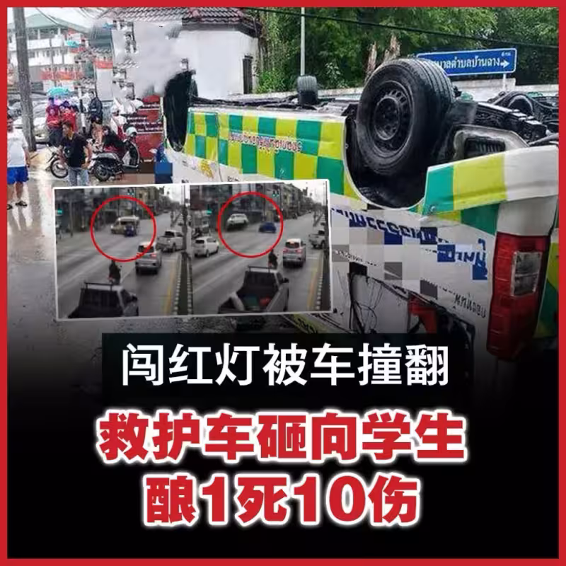 (羅勇23日綜合電)泰國羅勇府班昌縣一輛救護車接載病人時強闖紅燈,遭一輛綠燈直行的轎車來不及煞停攔腰猛撞,救護車頓時失控翻覆,砸向騎著摩托車正在等候紅燈的學生群,造成一名女學生身亡,至少10名學生和家長受傷。