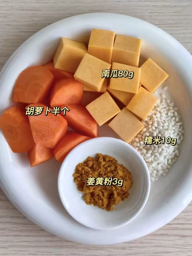 南瓜和胡蘿蔔去皮切塊,和糯米一起放進鍋里,加適量清水煮到軟爛。然後全部倒入攪拌機,加薑黃粉一起打成細膩的糊狀,再倒回小鍋溫熱一下就可以喝了。