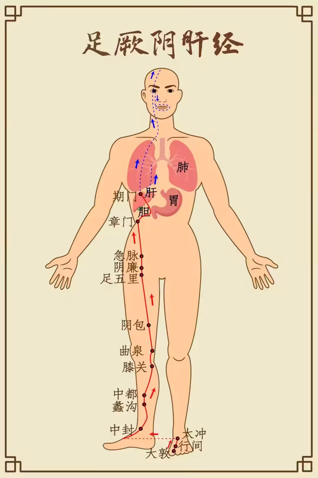 肝經又叫足厥陰肝經,本經一側有14個穴位(左右兩側共28穴):大敦,行間,太沖,中封,蠡溝,中都,膝關,曲泉,陰包,足五里,陰廉,急脈,章門,期門。