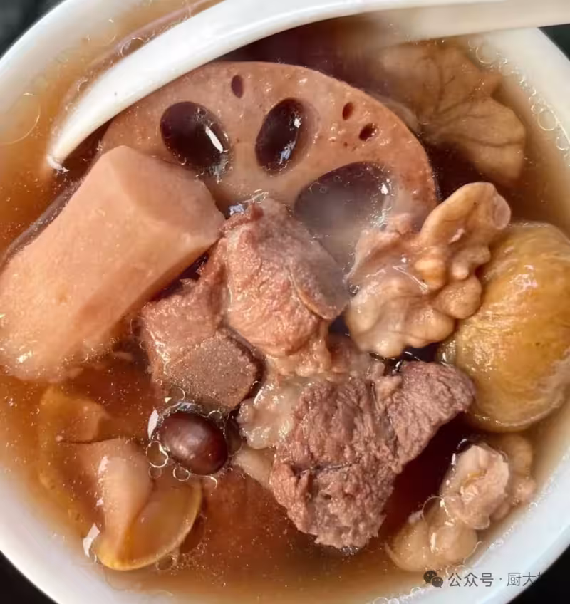 食材: 排骨,蓮藕,板栗,黑豆,紅棗,核桃,淮山 做法: ①排骨焯水,蓮藕切段 ②所有食材洗凈放入鍋中 ③加適量溫水大火煮沸轉小火1小時 ④出鍋前加入鹽調味即可,(可燉可煲)味道好極了