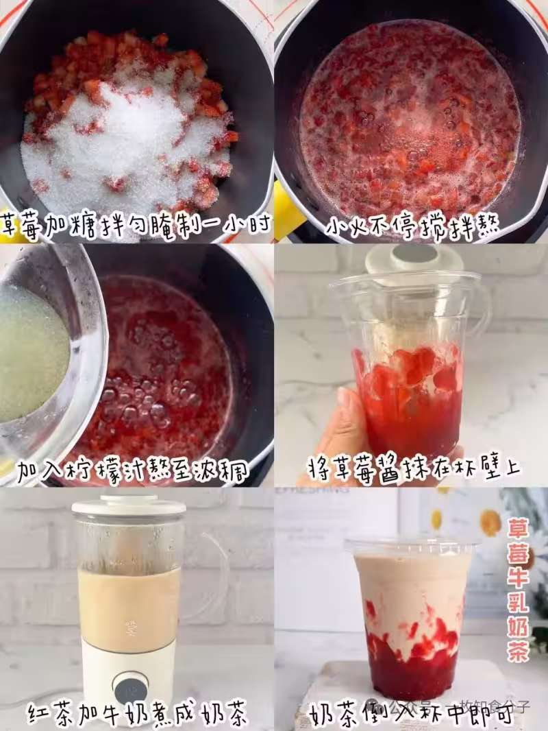 食材:草莓100g|糖35g|檸檬汁10g|牛奶300ml|紅茶包2個