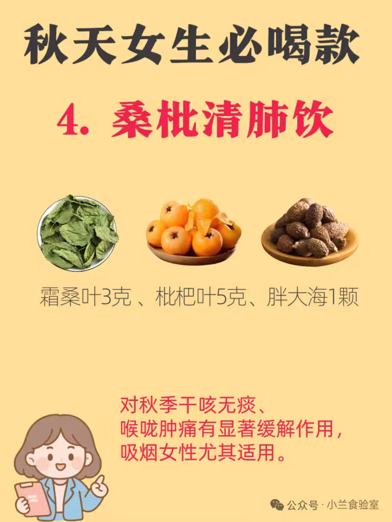 桑葉清肺潤燥,枇杷葉止咳化痰,胖大海利咽開音。對秋季乾咳無痰、喉嚨腫痛有顯著緩解作用,吸煙女性尤其適用。