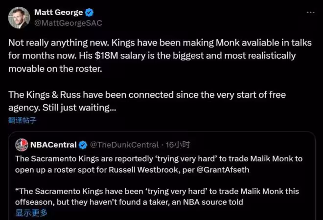 國王做事總是出人意料,至少從最近兩個賽季看,蒙克怎麼看也比威少強,上賽季蒙克場均得到17.2分3.8籃板5.6助攻0.9搶斷,三分命中率32.5%,他正處於生涯巔峰,而且打法適合聯盟大部分球隊。反觀威少,他職業生涯巔峰時是最具影響力的球員之一,憑出色的運動能力和爆發力十足的第一步重新定義了控球後衛,是NBA歷史上永遠被銘記的三雙王。離開雷霆後,威少狀態急速下降,但上賽季在掘金他似乎又找回了比賽的感覺,他的傳球創造力以及積極態度對隊友產生了很大影響,威少利用他豐富的經驗幫助掘金在季後賽屢過險境。但這並不代表國王引進他就沒有風險了,甚至是必須在送走蒙克的前提下。