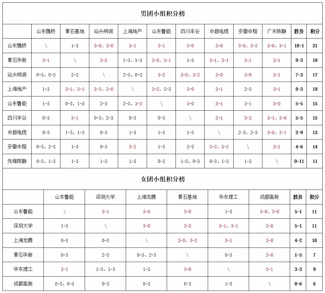 11:00,山東魏橋·向尚運動男團VS上海地產集團男團、汕頭明潤男團VS山東魯能男團、安徽中程單招基地男團VS先鋒乒羽陳靜男團,山東魯能女團VS黃石華新女團;