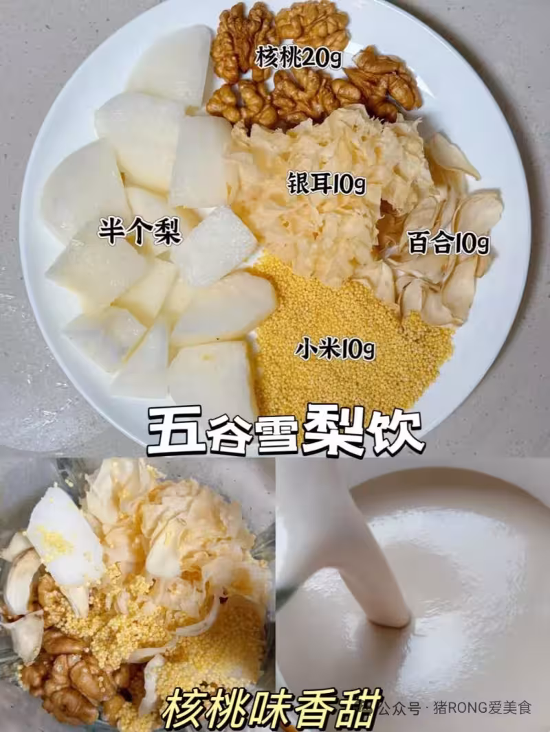 5️⃣五穀雪梨飲:半個梨+核桃20g+百合10g+小米15g+加水 破壁機水位線600ml位置